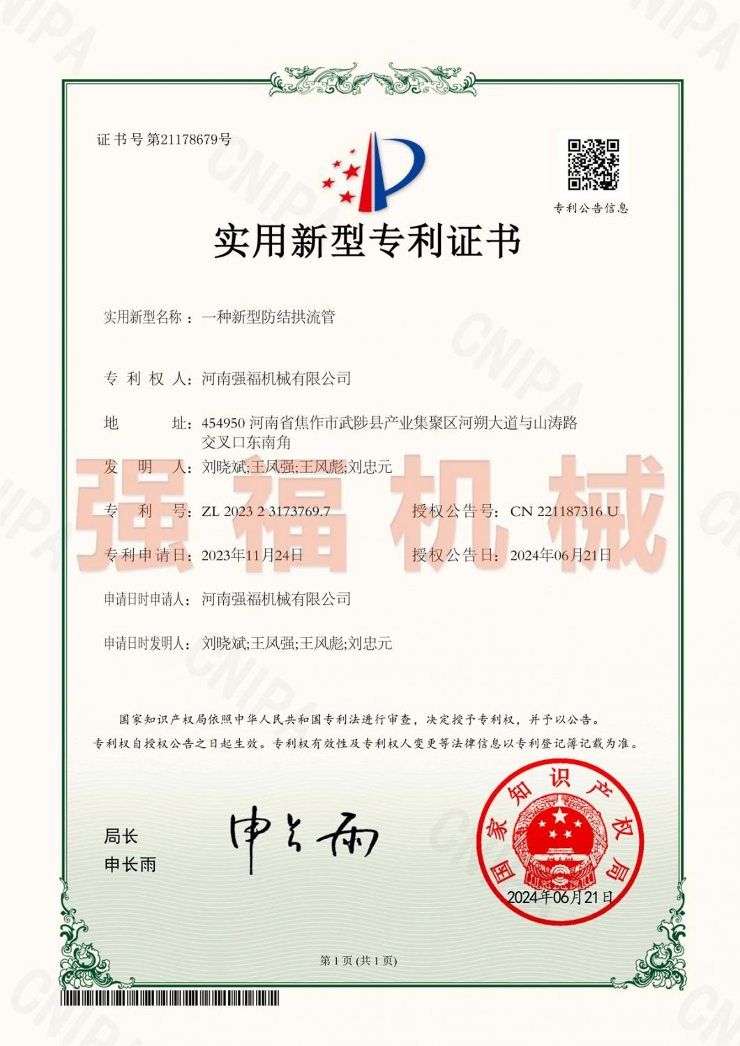 強福機械新增輸送設備新型防結拱流管專利證書